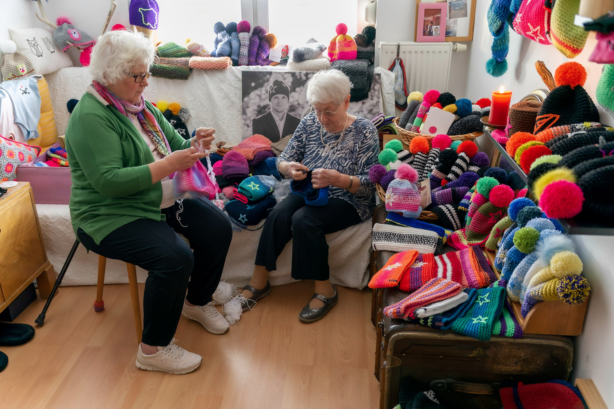 Die Mützen und Stirnbänder von pinkbommel werden in generationsübergreifender Arbeit von Familienangehörigen und Honorarkräften angefertigt. Dabei wird auf die Erfahrungswerte der "Älteren" neue Ideen, Trends und Akzente der "Jüngeren" vertraut.