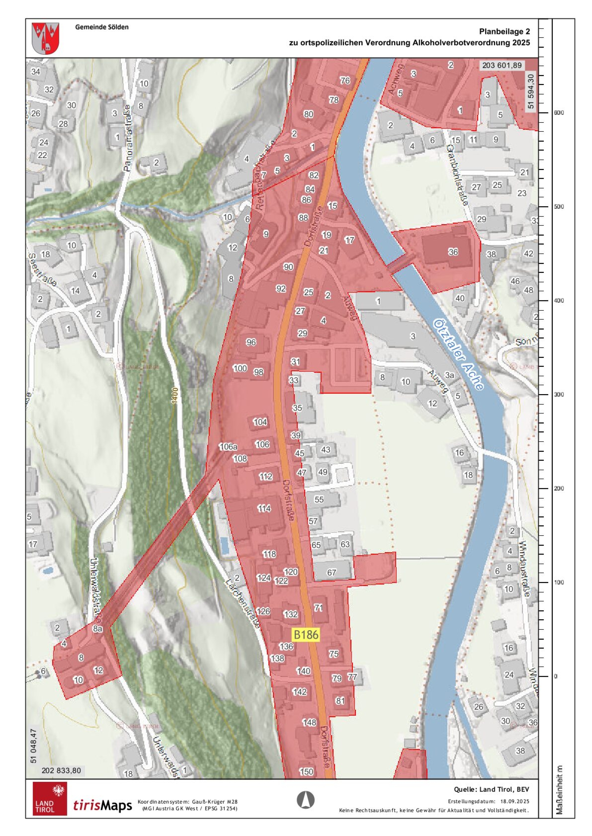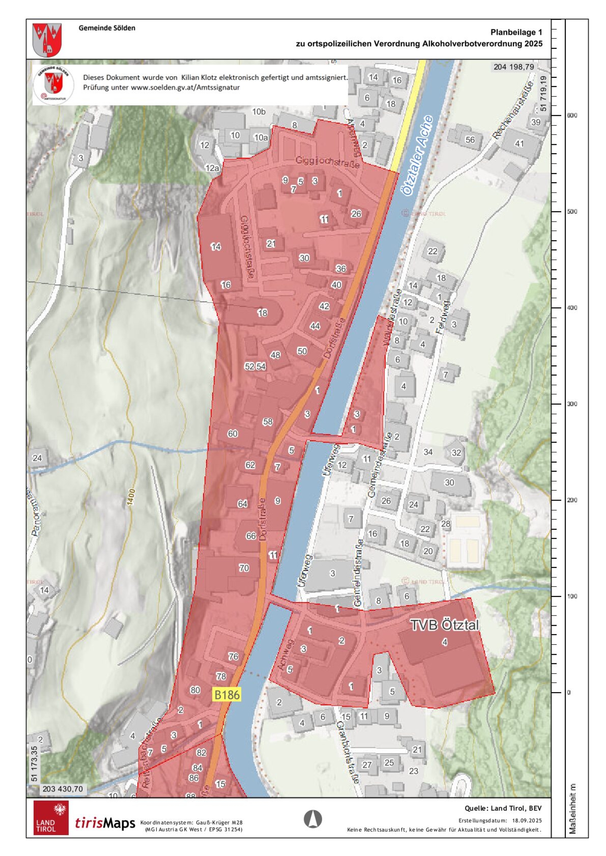 Ab 1. Dezember 2025 gilt im Ortszentrum von Sölden entlang der Dorfstraße und in den angrenzenden Bereichen eine alkoholfreie Zone. Mit dieser Maßnahme möchte die Gemeinde Sölden für mehr Ruhe, Sicherheit und Lebensqualität sorgen sowohl für Einheimische als auch für Gäste. Der Gemeinderat Sölden hat die Regelung im Herbst 2025 beschlossen. Sie gilt bis 19. April 2026 und umfasst den Bereich von der Giggijochbahn bis zur Gaislachkoglbahn inklusive der Plätze rund um die Freizeit Arena, das Sozialzentrum Waldele und den Zentrumsshuttle (Tal- und Bergstation).
