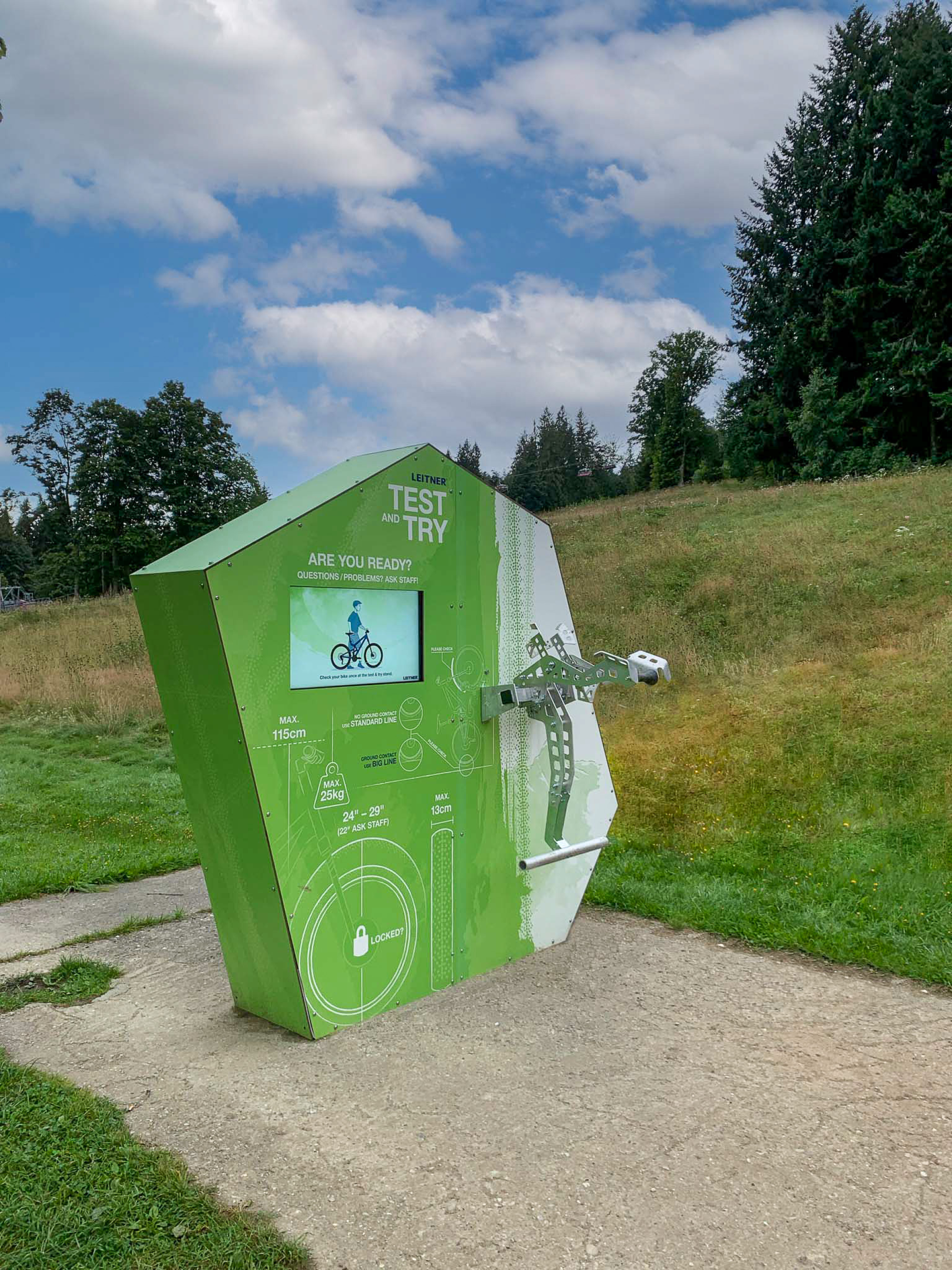 Damit Biker das Transportsystem in Ruhe kennenlernen können, hat LEITNER die Bike Box entwickelt. Das ist eine Teststation, die an der Talstation aufgestellt wird. Hier kann man sich vor dem Einstieg mit dem System vertraut machen. Erklärbilder und Texte geben Informationen zum Handling und zu den Anforderungen an das Fahrrad, damit es sicher transportiert werden kann. Alternativ kann auch ein Screen mit Erklärvideo installiert werden.