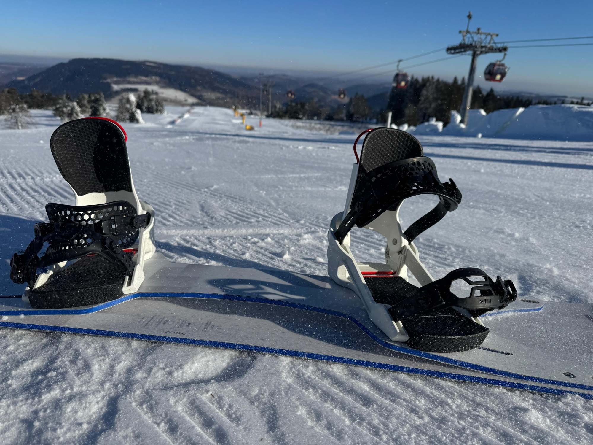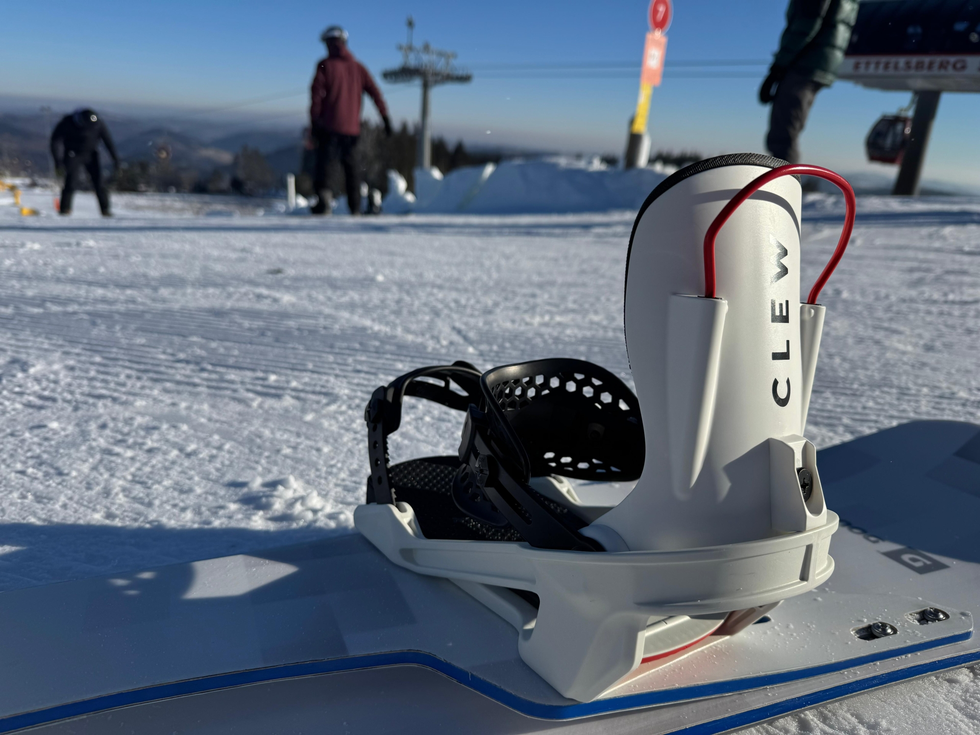 Ihr seid jetzt schon überzeugt von der CLEW-Bindung? Dann gibt es noch einige praktische Aspekte zu beachten: Es ist empfehlenswert, den Toe-Strap nicht zu stark anzuziehen, da dies den Ein- und Ausstieg erschweren kann. Außerdem kann es vorkommen, dass sich die Rasterstellungen der vorderen Ratschen durch Druck oder das Ablegen des Boards leicht verstellen, was das erneute Einrasten gelegentlich beeinträchtigen kann – ein Effekt, der auch bei anderen Schnell-Einstiegssystemen auftritt. Angesammelter Schnee zwischen Base und Bügel stellte in unserem Test – vielleicht auch aufgrund der geringen Schneelage und Beschaffenheit des Schnees – kein Problem dar. Völlig auszuschließen ist es aber natürlich nicht, dass sich hier auch mal Schnee festsetzt und man vor dem Einsteigen diesen entfernen muss.