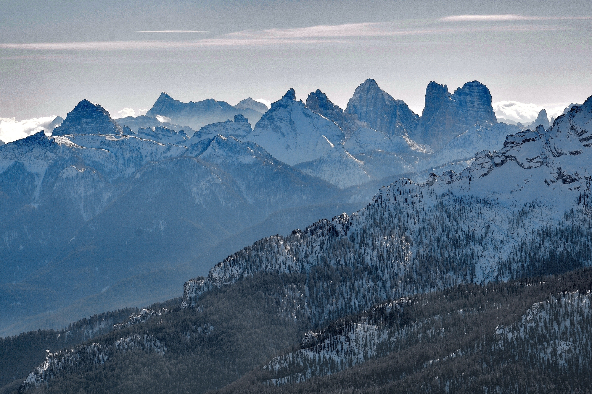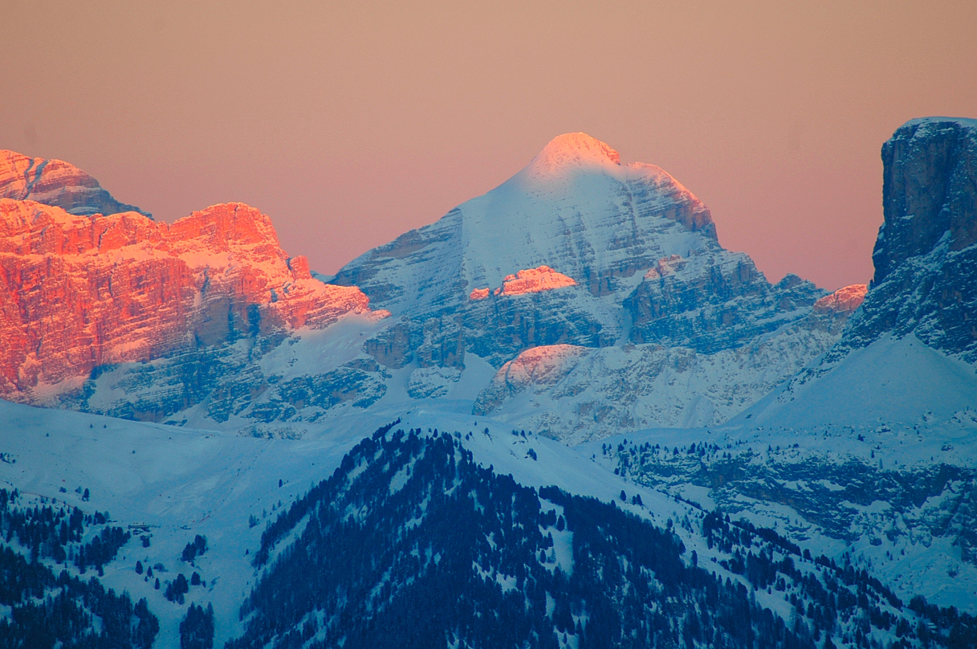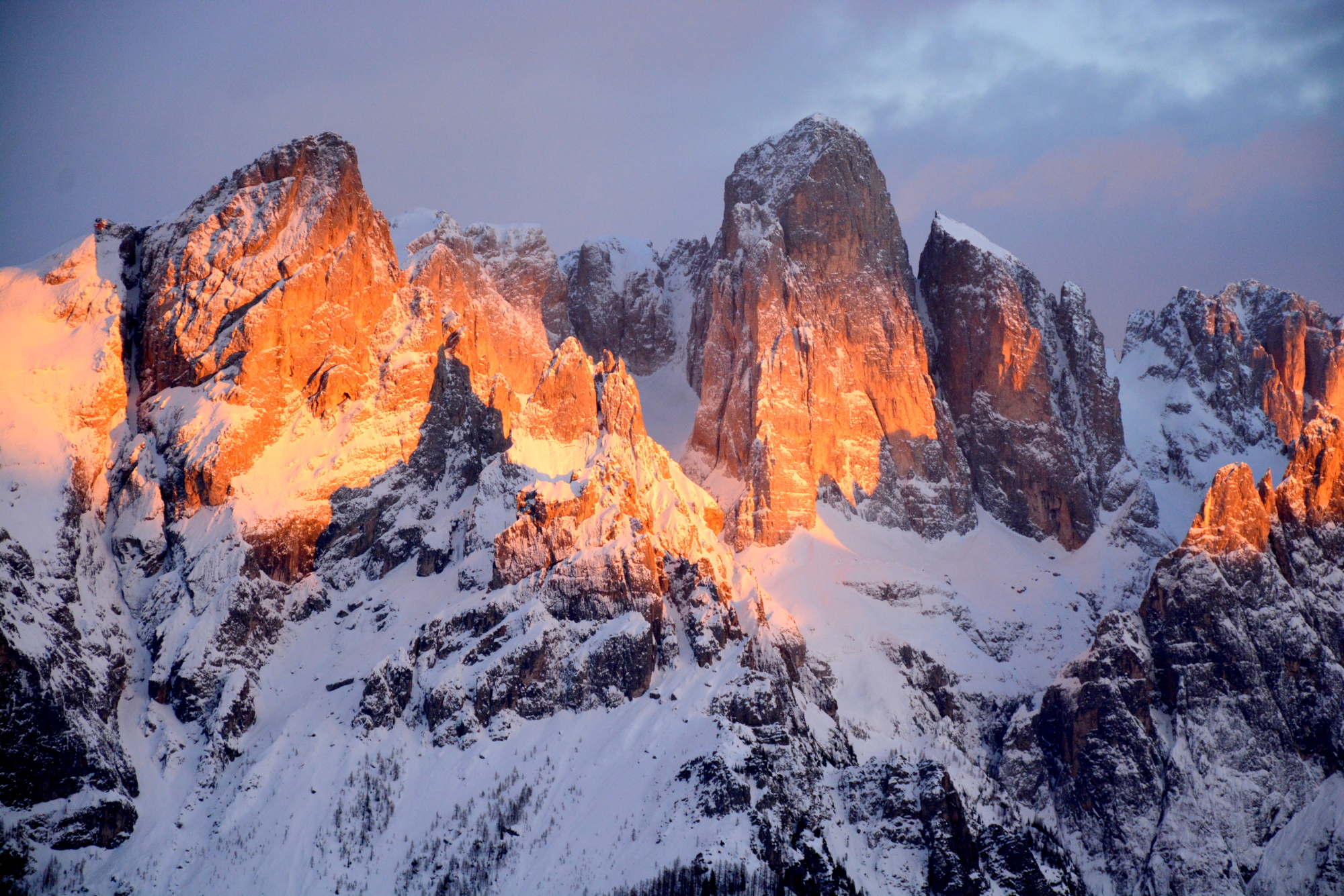 Die Pala-Berge bilden die südlichste Gruppe der Dolomiten. Mit ihren beeindruckenden Gipfeln hat sie schon so manchen Künstler und Schriftsteller inspiriert. Wer zum Betriebsschluss der Lifte im Skigebiet von San Martino di Castrozza südlich des Rolle Pass bei der Bergstation auf der Cima Tognola (2343 m) steht, kann an der mächtigen Pala-Westseite ein spektakuläres Alpenglühen beobachten: Die tiefstehende Sonne taucht die Felsen und Gipfel der riesigen Felsmauer, aus der berühmte Kletterberge wie die Cima della Madonna (2752 m) mit ihrer „Schleierkante“, oder die eindrucksvolle Turmgestalt des Sass Maor (2812 m) besonders hervorstechen, in strahlend gelbe, orange und rote Farben, während die Umgebung schon im Dunkel versinkt.