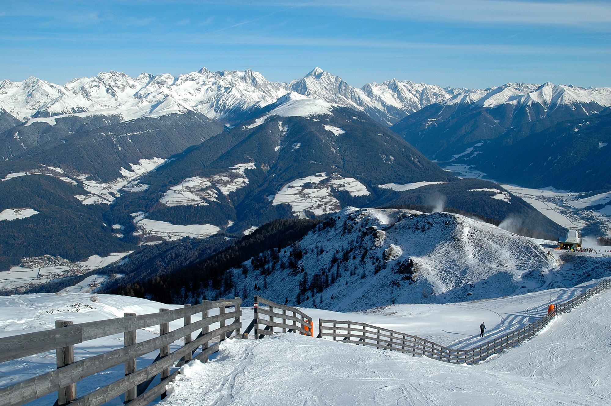 Der Kronplatz ist der Hausberg von Bruneck. Auf dem fantastischen Aussichtsgipfel und ungemein beliebten und weltcuperprobtem Skiberg befindet sich auch die monumentale, 18 Tonnen schwere Friedensglocke „Concordia 2000“, die täglich um 12 Uhr läutet und Frieden symbolisiert. Die Aussicht ist phänomenal: Vom Kronplatz aus hat man bei klarem Wetter ein atemberaubendes 360-Grad-Panorama auf die Dolomiten, darunter bekannte Gipfel wie die Marmolada (3343 m), die Puez-Gruppe mit der Westlichen Puezspitze (2918 m) und den Peitlerkofel (2875 m) und einen weiten Blick über das Pustertal und den Alpenhauptkamm (Stubaier Alpen, Zillertaler Alpen, Ötztaler Alpen, Rieserfernergruppe, Sarntaler Alpen, Sesvennagruppe, etc.) hinweg. So ist der Kronplatz auch einer der wenigen Aussichtspunkte, wo man sowohl die Dolomiten (südlich) als auch den Alpenhauptkamm (nördlich) perfekt sieht. Geheimtipp: Von der Aussichtsplattform des MMM Corones (Messner Mountain Museum) am Kronplatz Gipfel ist die Aussicht noch exklusiver.
