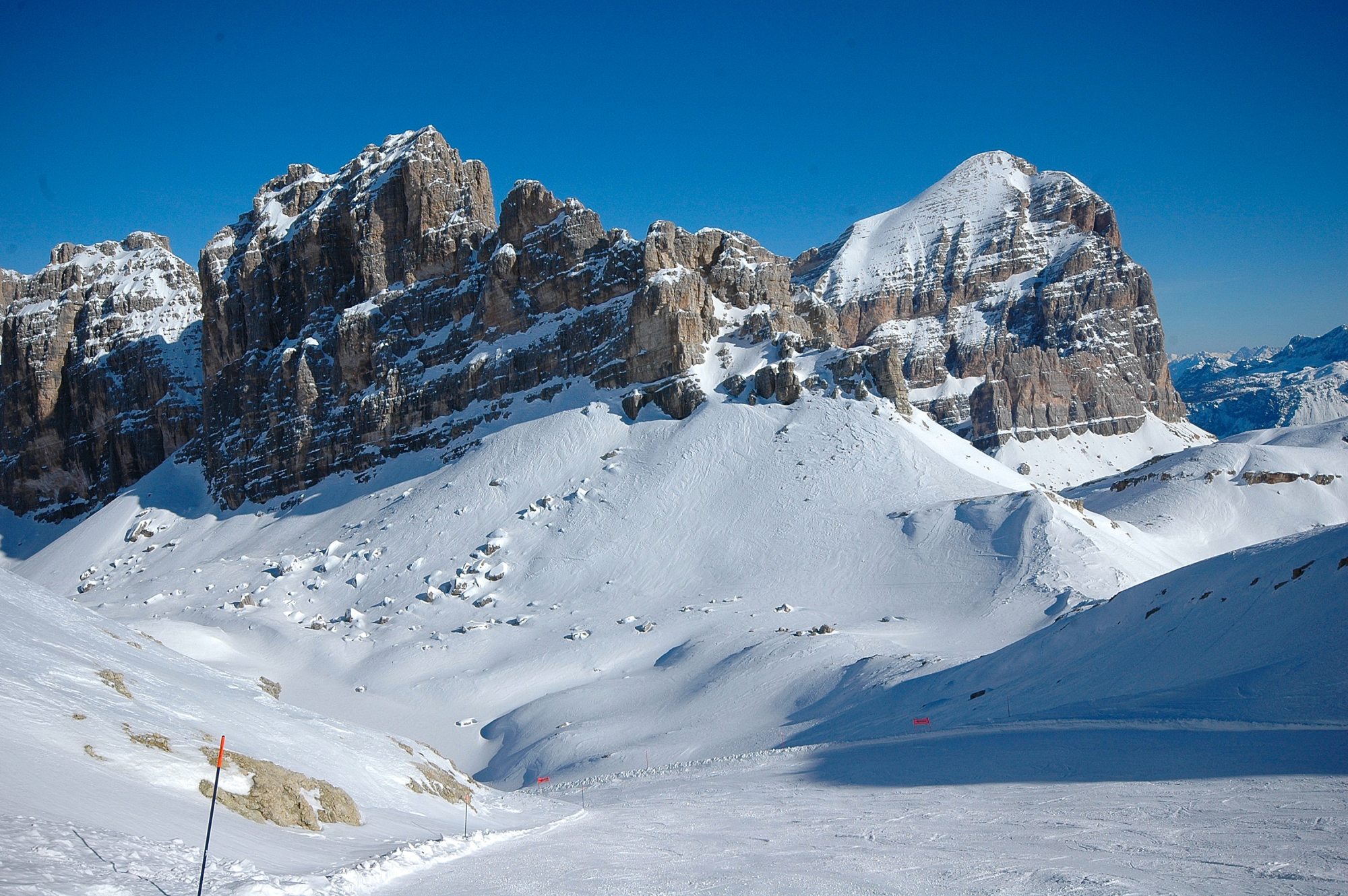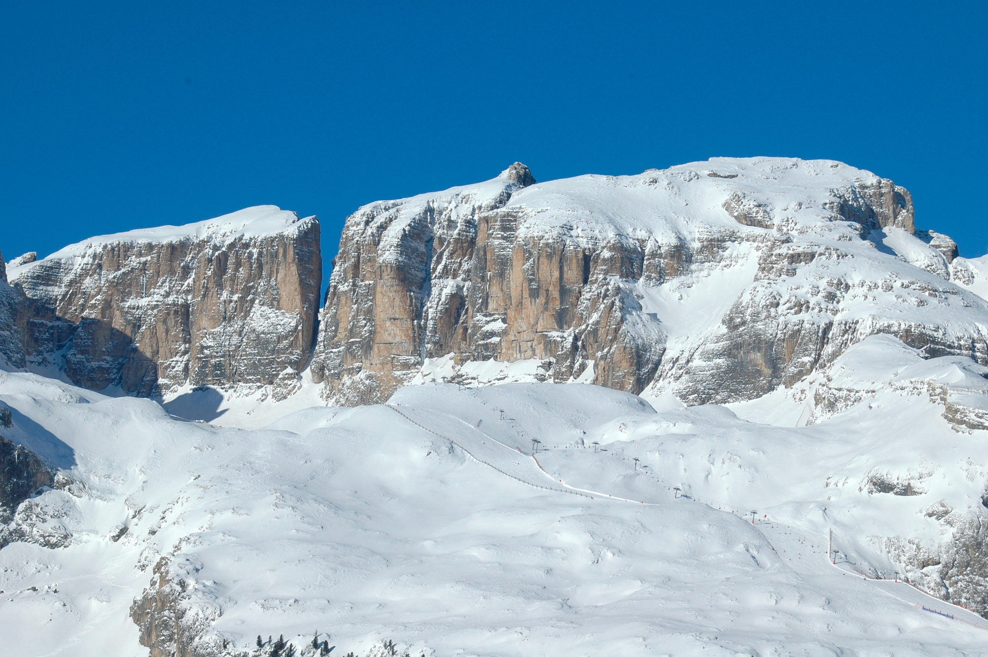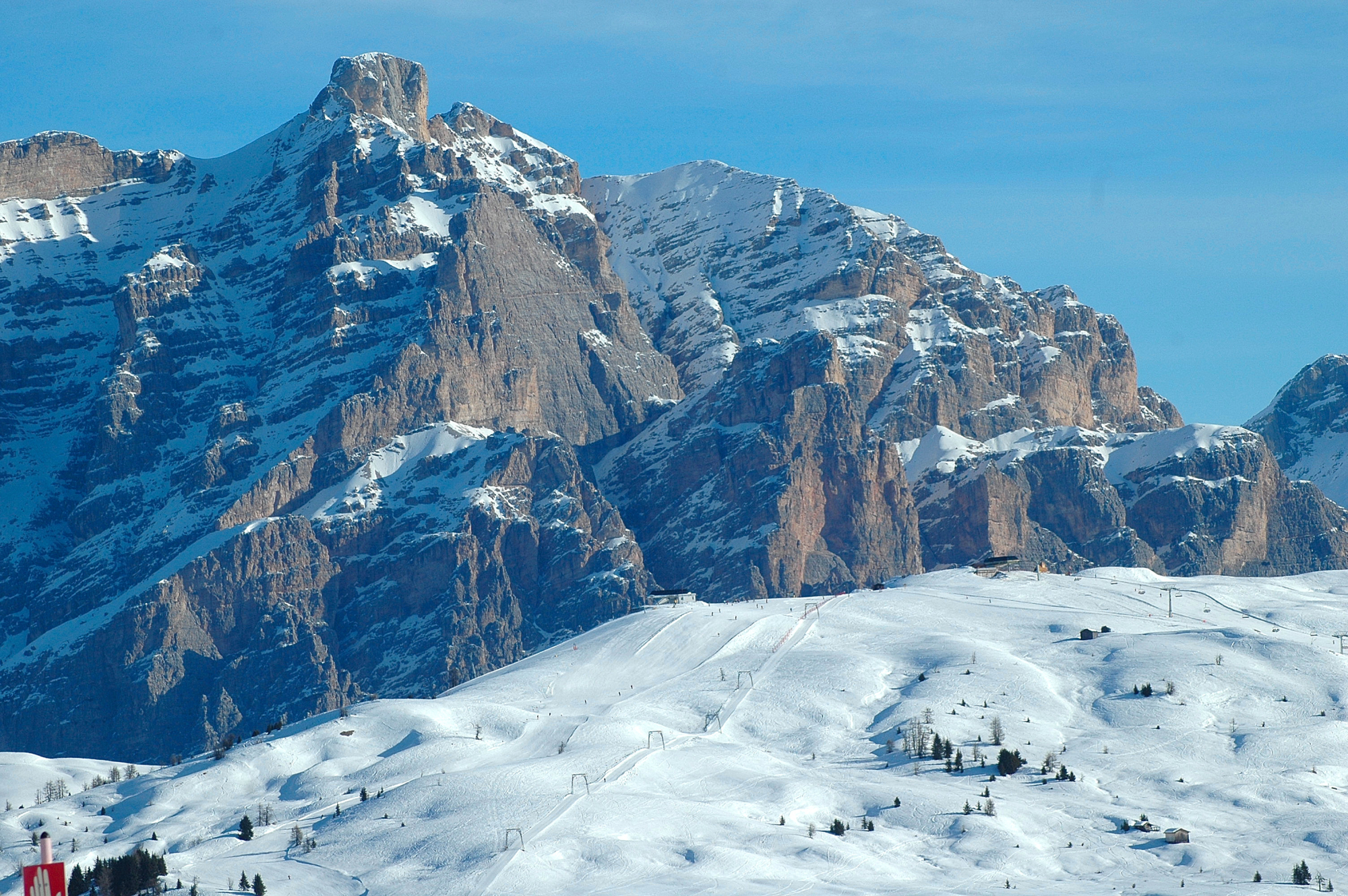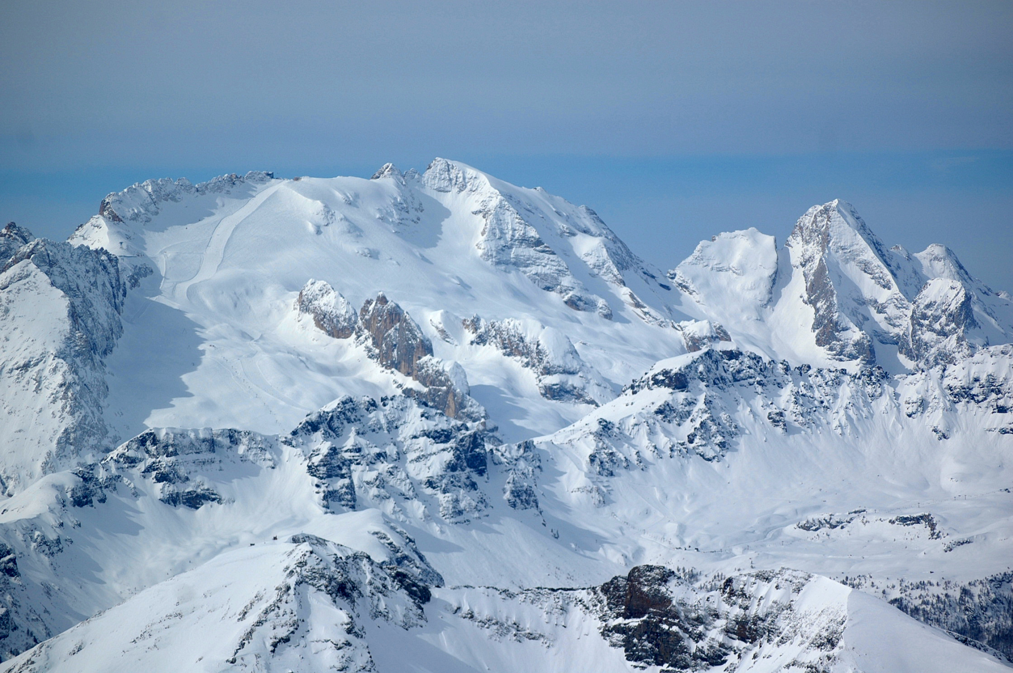 Skigebiet Arabba/Marmolada: Von der Porta Vescovo (2478m) hat man einen glanzvollen Blick auf Marmolada (3342m) und Gran Vernel (3210m), aber auch zum Biz Boe (3152m); vom Sesselift „Sass de la Vegla“ blickt man direkt über den Gipfel des Col di Lana zum Dreigestirn der Tofane. Bei der Abfahrt vom Padon Pass zum Fedaia Pass (und weiter nach Malga Ciapela) zieht die Marmolada die Blicke magisch an.