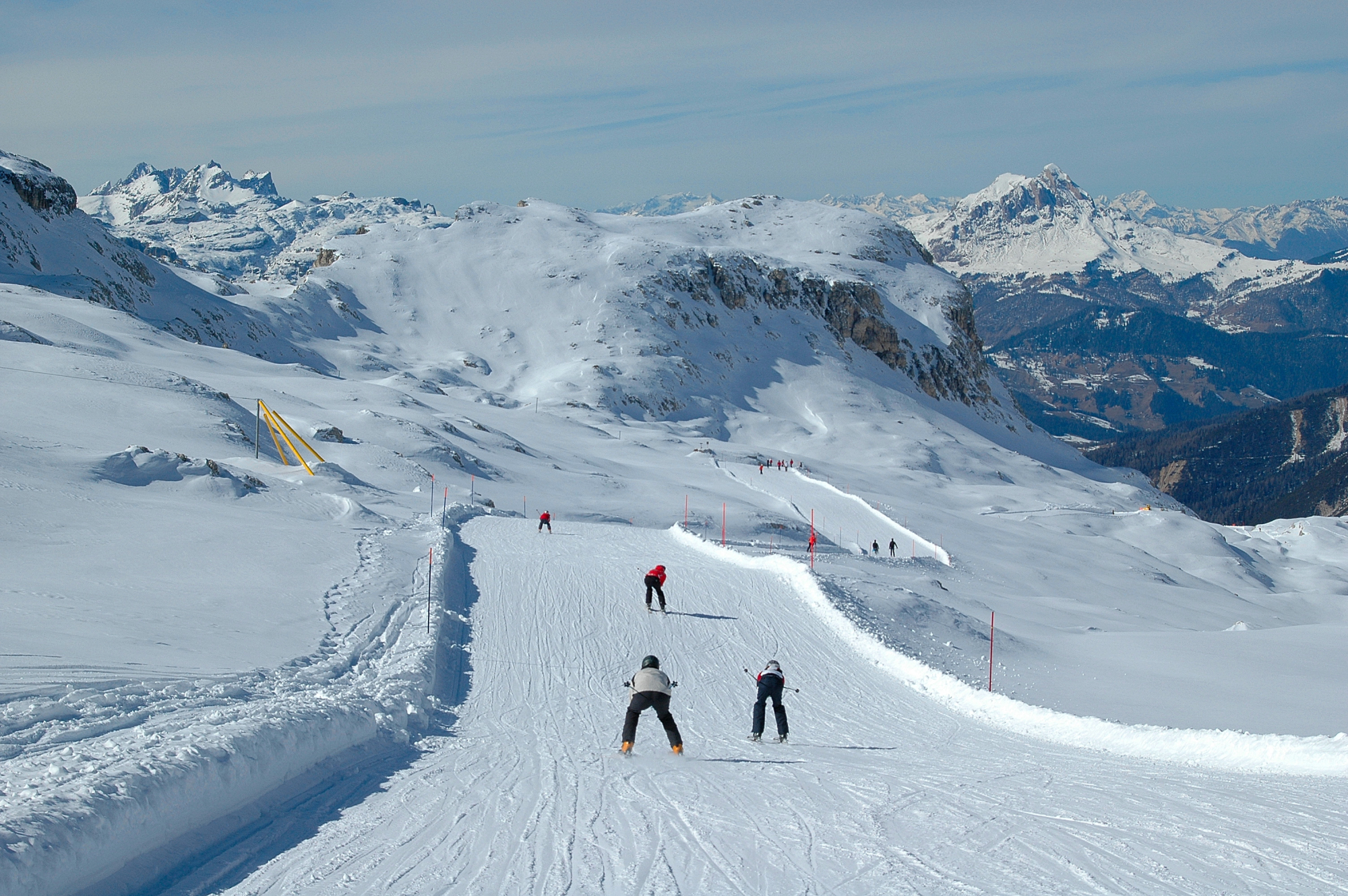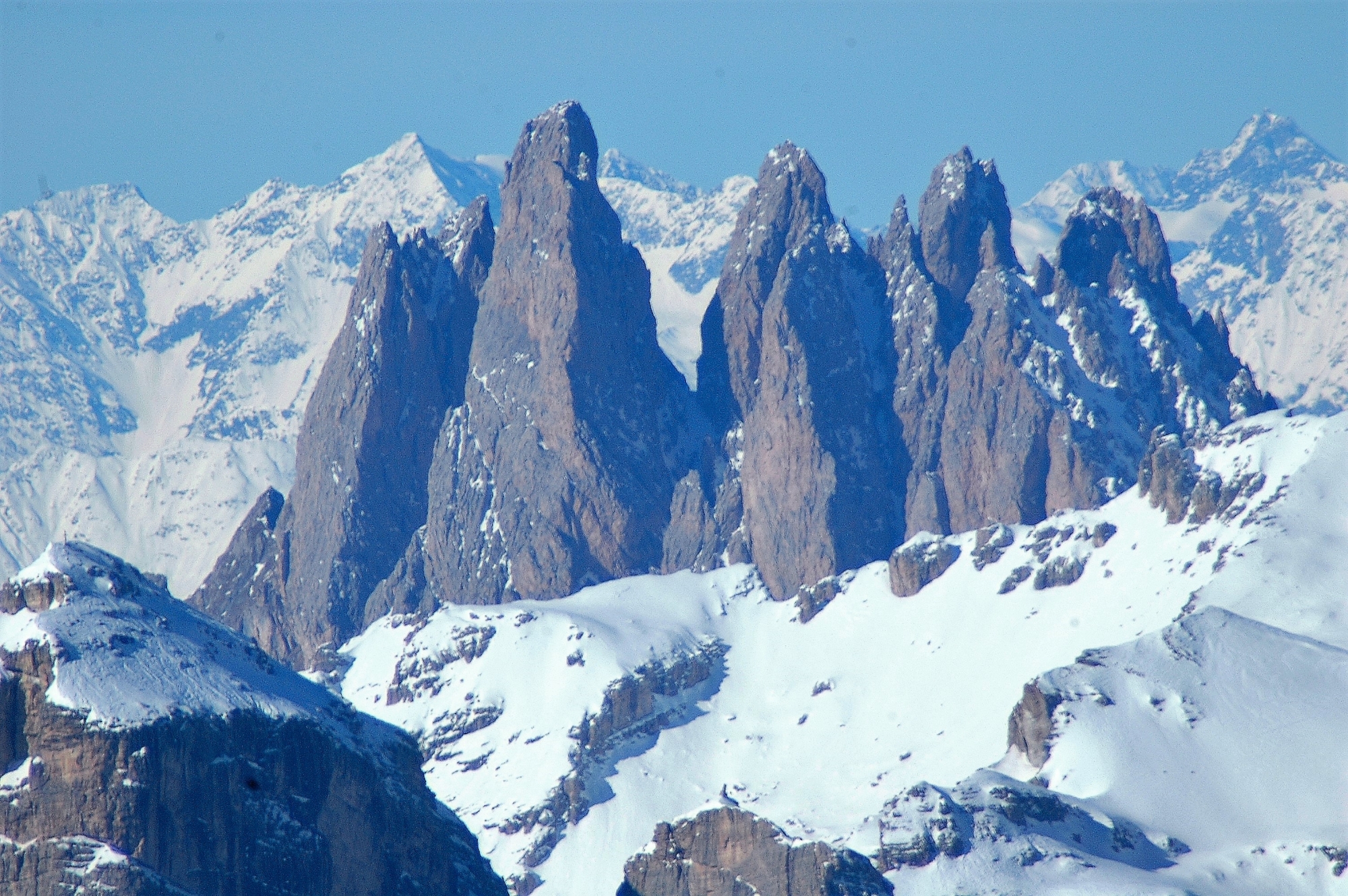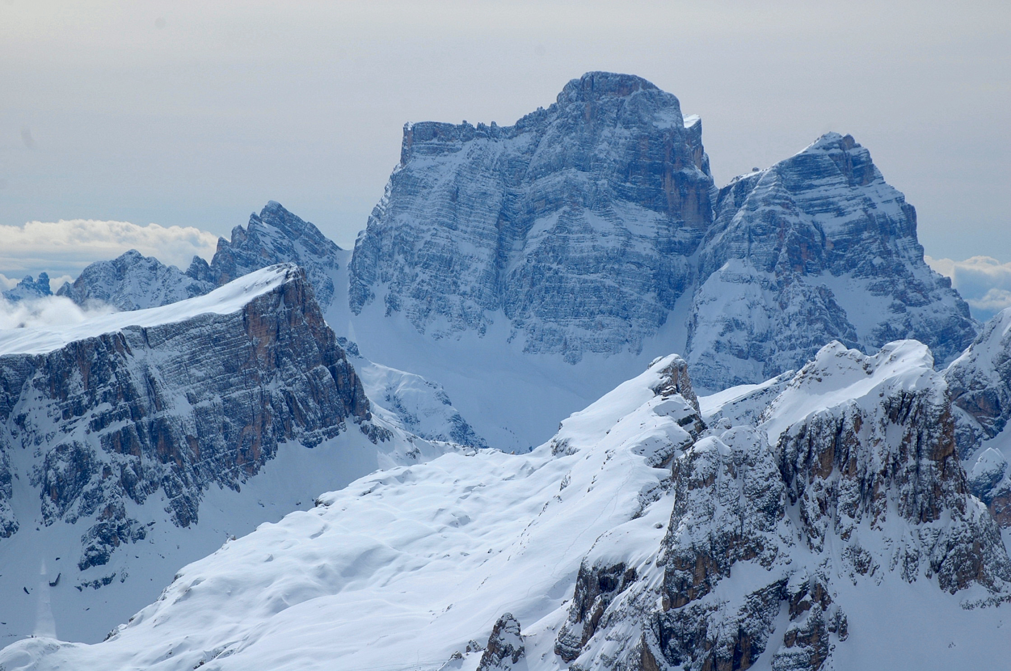Skigebiet Arabba/Marmolada: Von der Porta Vescovo (2478m) hat man einen glanzvollen Blick auf Marmolada (3342m) und Gran Vernel (3210m), aber auch zum Biz Boe (3152m); vom Sesselift „Sass de la Vegla“ blickt man direkt über den Gipfel des Col di Lana zum Dreigestirn der Tofane. Bei der Abfahrt vom Padon Pass zum Fedaia Pass (und weiter nach Malga Ciapela) zieht die Marmolada die Blicke magisch an.