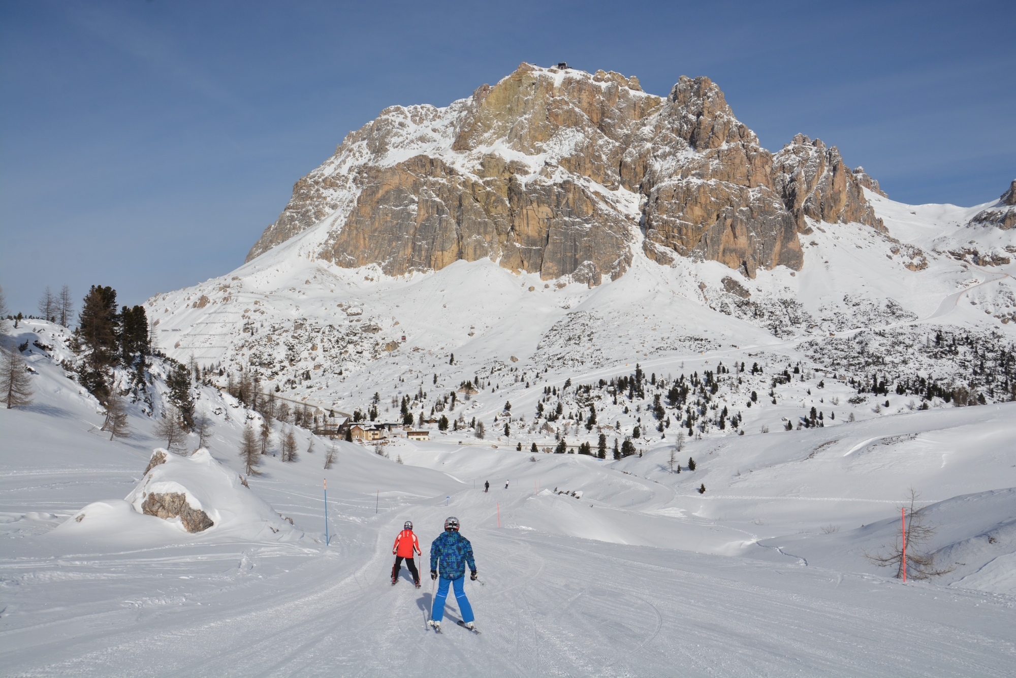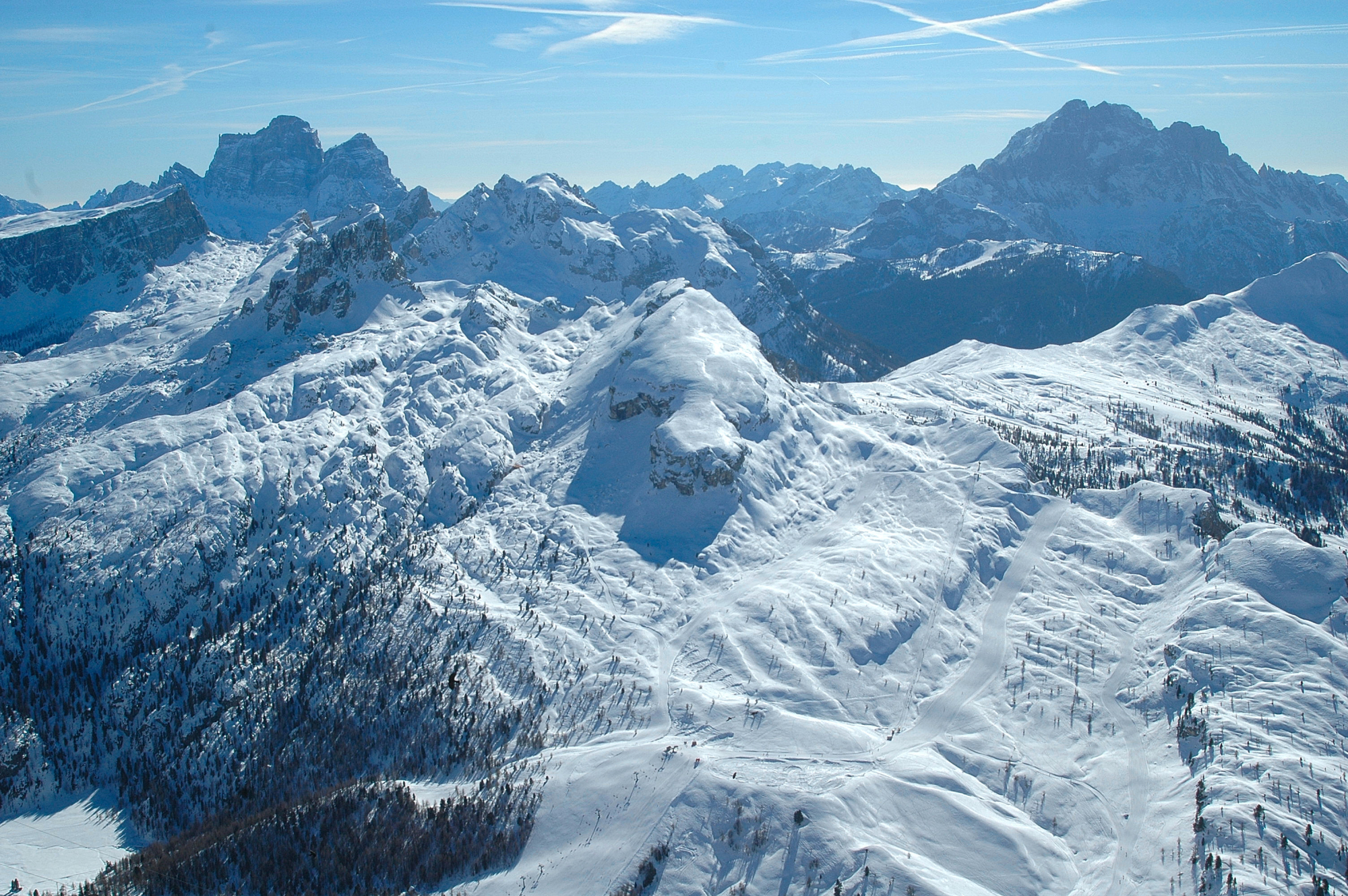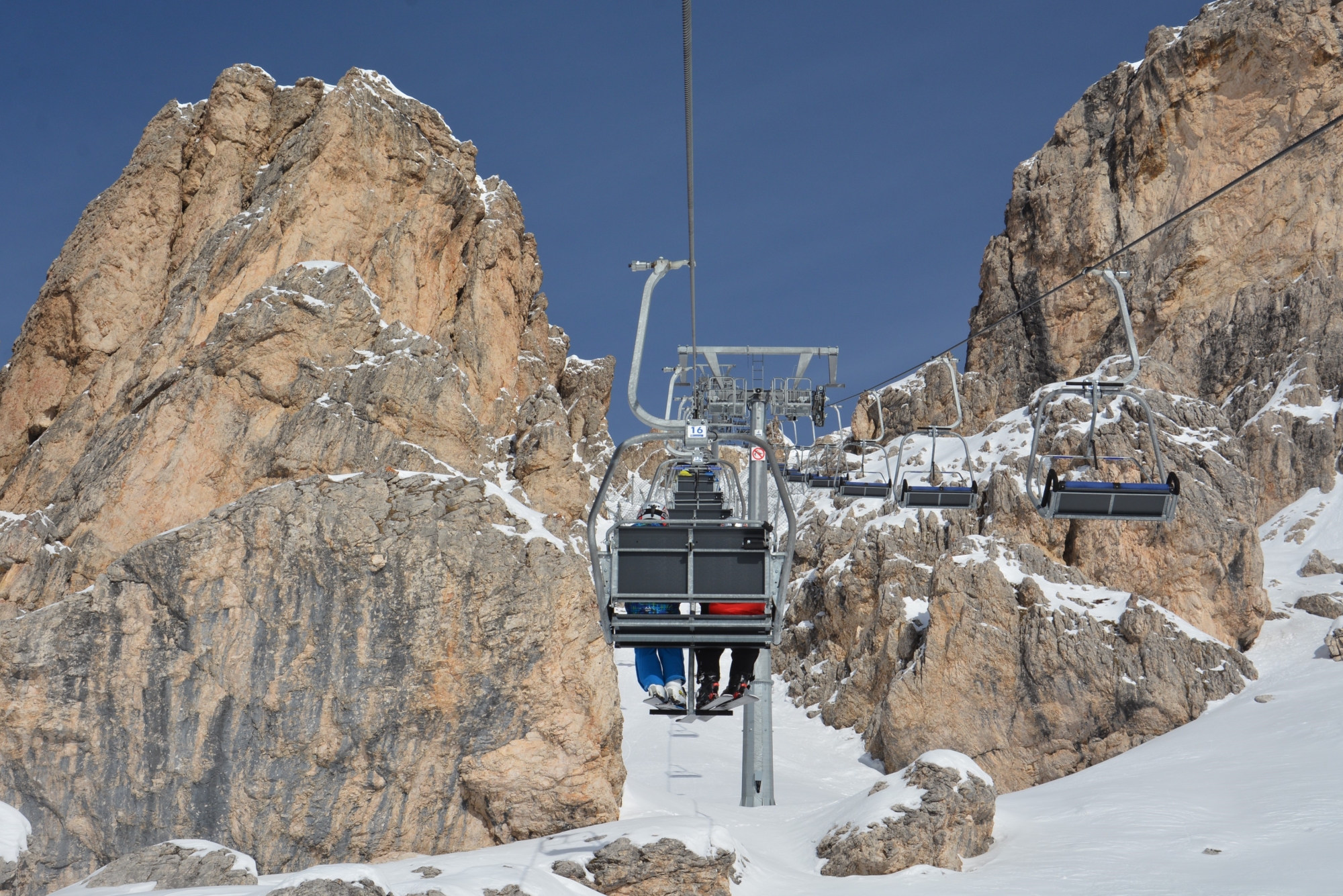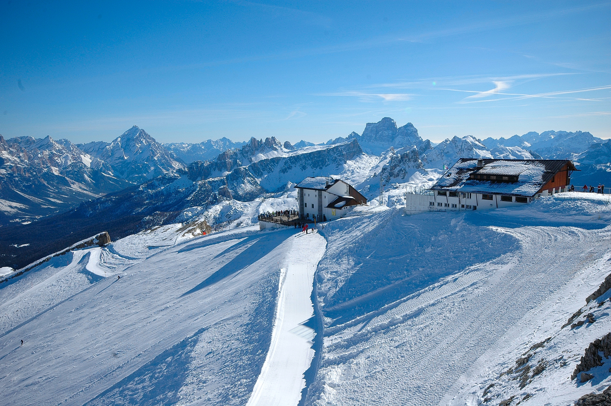 Skigebiet Falzarego Pass/Lagazuoi: Die Bergstation der Lagazuoi-Seilbahn (imposante Luftseilbahn ohne Stützen) befindet sich knapp unter den Gipfel des Lagazuoi (2778m); wer nicht auf die Marmolada fährt erreicht hier den höchsten Punkt der Runde. Das Bergpanorama gehört zu den allerschönsten der gesamten Dolomiten! Hier beginnt auch die magisch schöne Armentarola-Piste, die im unteren Teil auf die Scotoni-Hütte trifft und im Bereich der Capanna Alpina beim Pferdegespann endet.