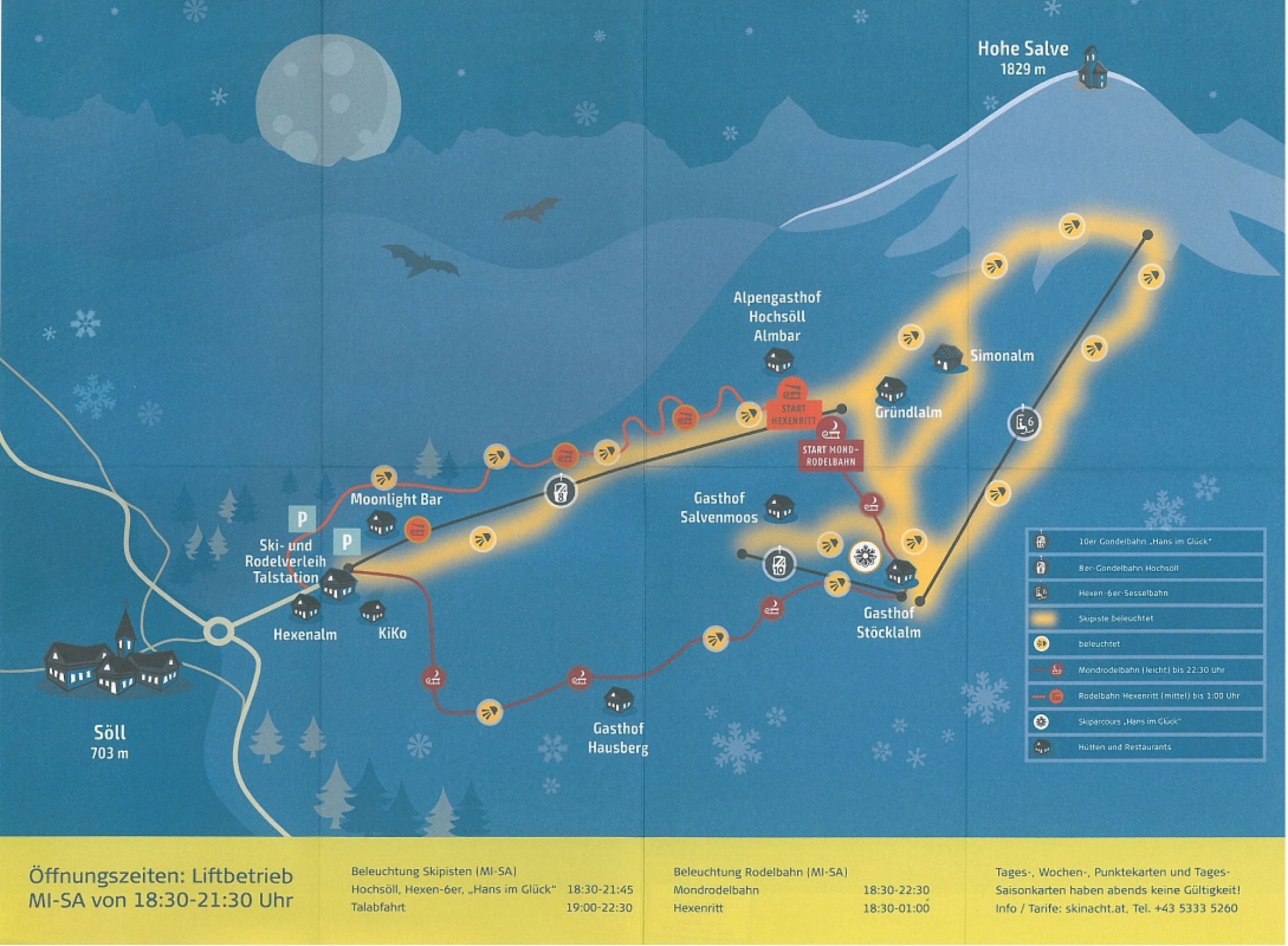 In Söll in der SkiWelt Wilder Kaiser-Brixental kann man auf bis zu 10 km Piste Flutlichtskifahren: Von Mittwoch bis Samstag sind fünf Abfahrten und die Funarea Hans im Glück beleuchtet, von 18:30 bis 21:30 Uhr sind dann drei Lifte in Betrieb. Damit findet sich hier nach eigenen Angaben das größte Nachtskigebiet von ganz Österreich! Aber auch Rodelfans kommen auf ihre Kosten: Gleich zwei beleuchtete Rodelbahnen gibt es hier: Die 4 km lange Mondrodelbahn, die auch für Familien geeignet ist, und der 3 km lange Hexenritt, der anspruchsvoller, enger und kurvenreicher ist. Bequem nach oben geht es auch für die Rodler mit der Gondelbahn, Schlitten können an der Talstation ausgeliehen werden.