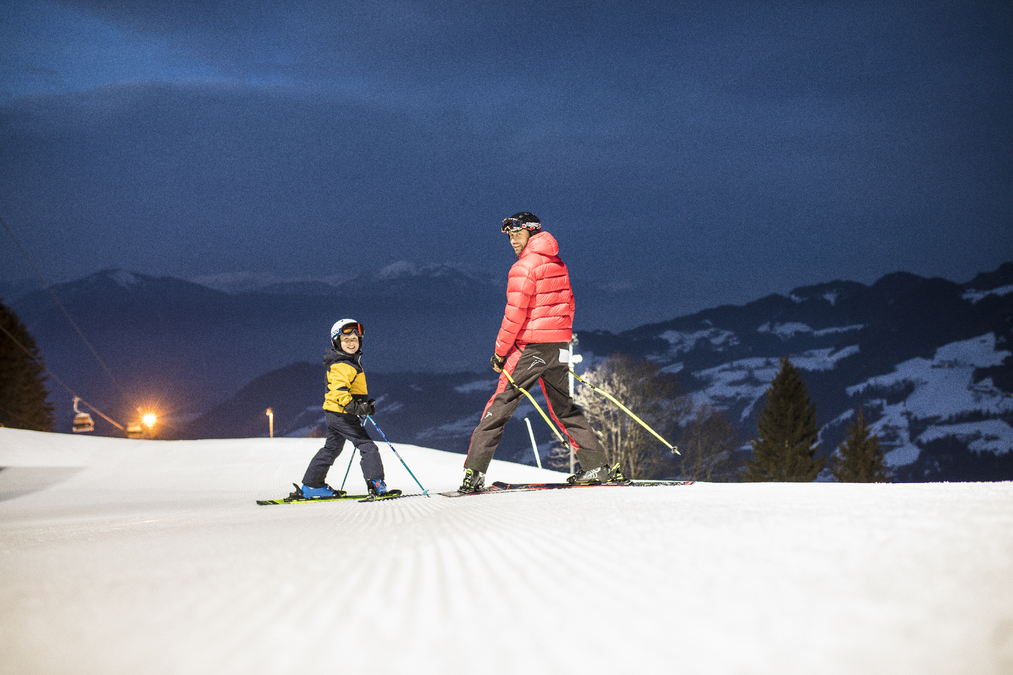 Der Skicircus öffnet auch am Abend seine Pforten: In Hinterglemm und in Leogang wird Nachtskifahren angeboten! In Hinterglemm ist dann der Lift A9 Unterschwarzbachbahn in Betrieb und die leichte Hauptabfahrt, die rote Variante, der SkiMovie Rennparcours und die Speedstrecke sind beleuchtet. Insgesamt hat so montags, mittwochs und freitags bis 21:30 Uhr mehr als ein Pistenkilometer geöffnet. Der Vorteil: Der Nachtskilauf ist im “normalen” Skipass inklusive, wer noch keinen Skipass vom Tageskilauf hat, kann aber natürlich auch eine extra Abendkarte kaufen! (Nachtskikarte 2025/26: 35,00 € | Kinder 17,50 €)