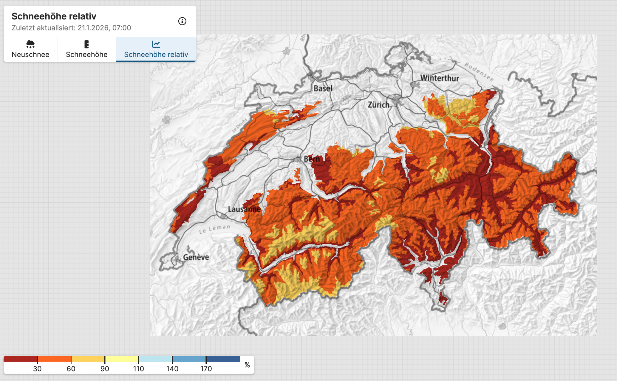 Schon wieder ist es fast überall in den Alpen rund zehn Tage her, als man die letzten Schneefälle verzeichnen konnte. Nur in den südlichsten Westalpen schneite es am vergangenen Wochenende zum Teil auch kräftig, ansonsten ist die Schneelage mittlerweile überaus dürftig, wie auch der Blick auf die relative Schneehöhe (Vergleich mit dem langjährigen Mittelwert 1991-2020) in der Schweiz zeigt: