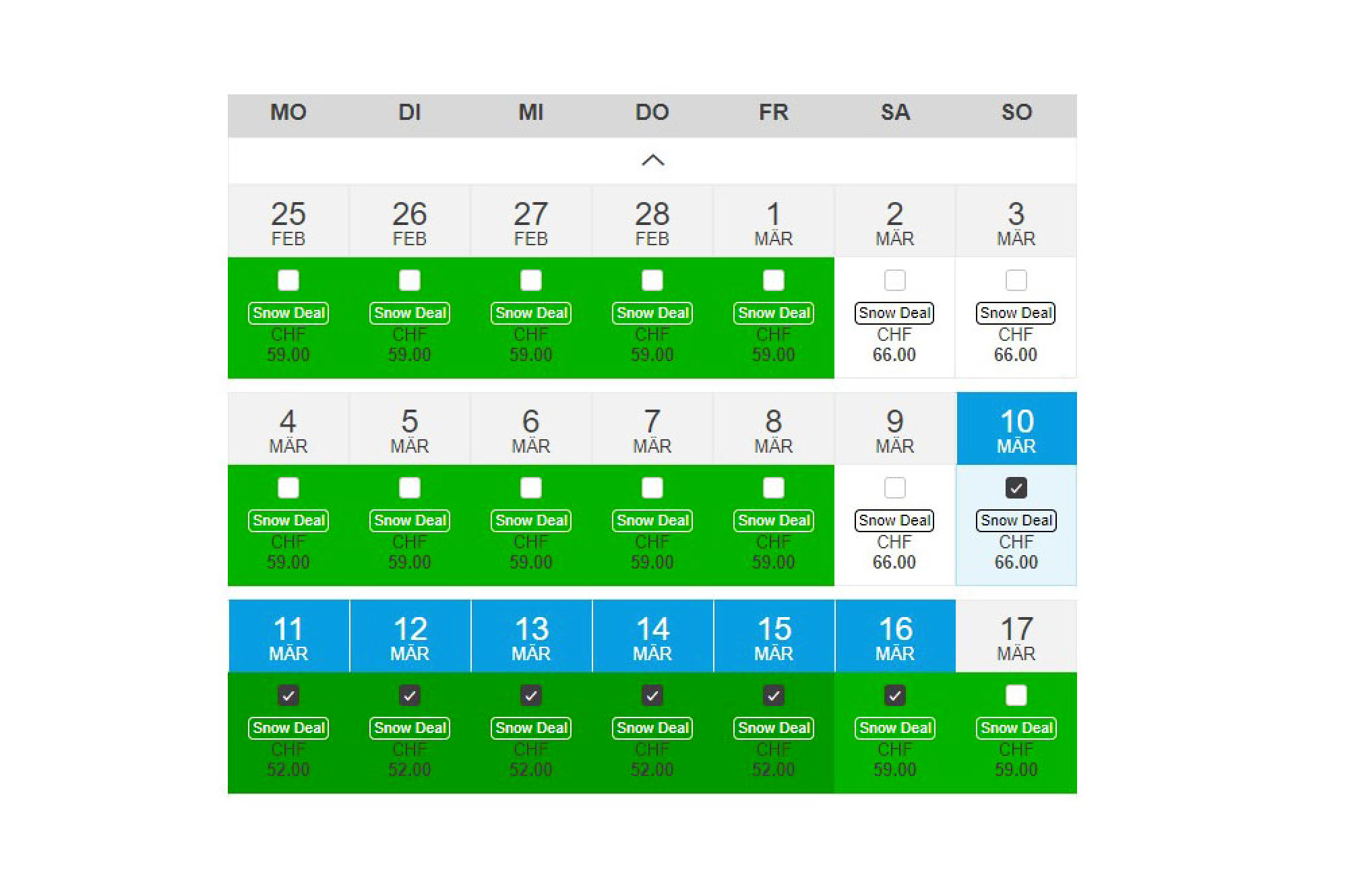 In der folgenden Abbildung wird der Tagespreis für einen Erwachsenen für Ende Februar und März dargestellt. Hierbei sind die günstigen Preise grün hinterlegt. In der Regel sind die Skipässe am Wochenende teurer als an Wochentagen:
