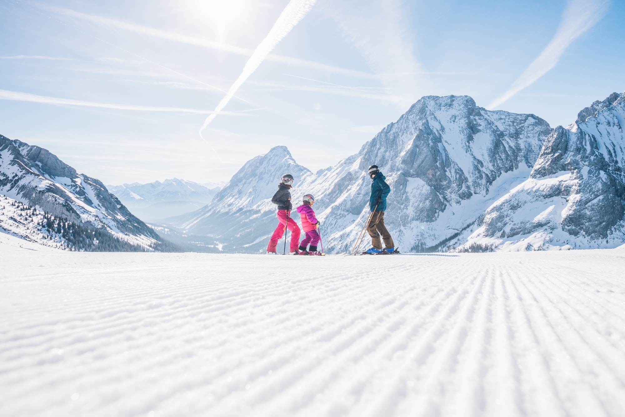 Auf der österreichischen Seite der Zugspitze befindet sich die Tiroler Zugspitz Arena, bestehend aus den insgesamt sieben Skigebieten von Ehrwald, Lermoos, Berwang, Biberwier, Bichlbach. Insgesamt erwarten die Gäste nicht nur ein toller Ausblick auf die spektakuläre Zugspitze, sondern auch 143 familienfreundliche Pistenkilometer und 57 Bergbahnen. Für Familien bieten die kleinen Ortschaften unzählige kinderfreundliche Unterkünfte und ein kostenloses Busnetz für Skipass- und Gästekarteninhaber – das natürlich auch die Talstationen der Bergbahnen abdeckt. Besonders toll für Anfänger sind unter anderem das große Übungsgelände an der Bergstation der Ehrwalder Almbahn oder auch die Blueline XXL am Grubigstein, mit knapp zehn Kilometern eine der längsten blauen Pisten Österreichs. Neben dem Skifahren bietet die Zugspitzarena natürlich auch viele Angebote abseits der Pisten, so zum Beispiel Rodeln, Eislaufen, Pferdeschlittenfahrten, Pistenbully-Fahrten oder Laserbiathlon. Zudem gibt es für Familien spezielle Skipasstarife!