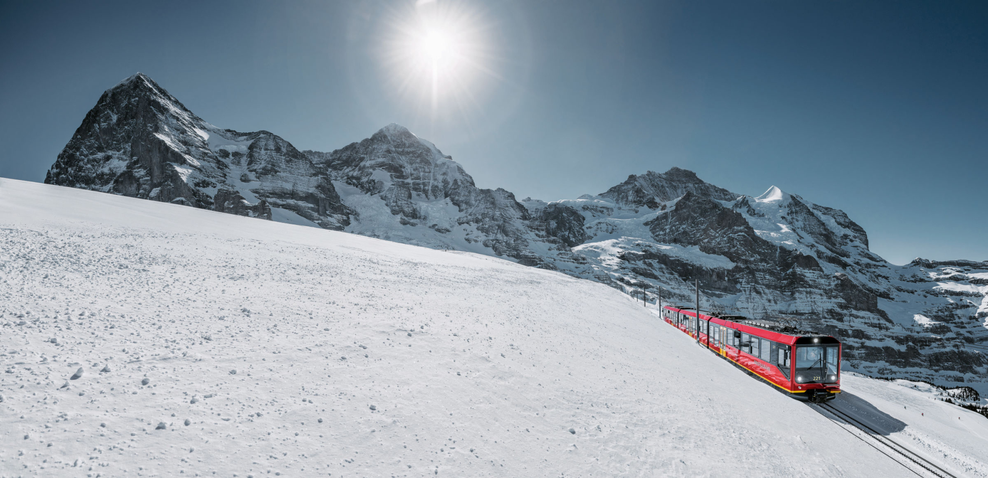 Die Jungfraubahn legt eine Strecke von neun Kilometern zurück, von denen sieben Kilometer durch einen Tunnel mitten durch die berühmten Berge Eiger und Mönch verlaufen. Auf ihrem Weg überwindet sie fast 1.400 Höhenmeter. An den Zwischenstationen Eismeer und Eigernordwand hat man einen fantastischen Blick direkt aus der Bergwand durch große Panoramafenster.