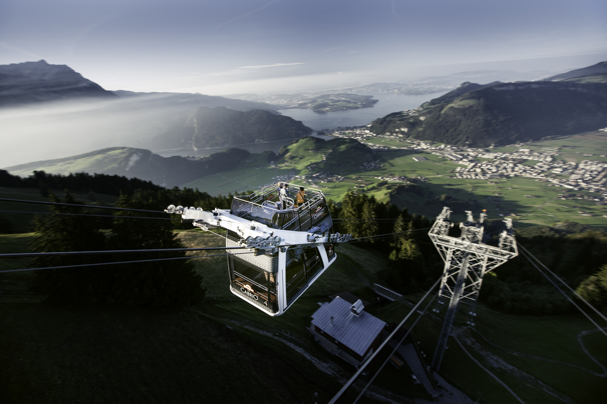 Cabrio fahren ist nicht nur mit dem Auto, sondern auch mit der Seilbahn möglich. Zwischen Stans und dem Stanserhorn in der Zentralschweiz verkehrt die CabriO-Bahn: In der unteren Etage haben bis zu 60 Personen Platz und wer möchte, kann über eine Treppe nach oben auf das Sonnendeck steigen. Hier können rund 30 Passagiere mitfahren und sich den Wind um die Nase wehen lassen.