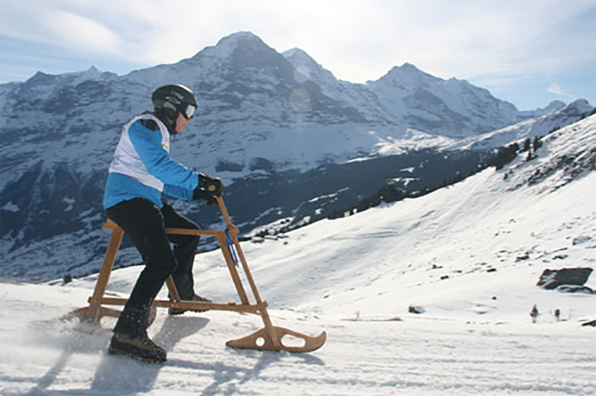 Am 06. Februar 2022 wird in der Jungfrau Ski Region die Weltmeisterschaft im Velogemel ausgetragen. Das Velogemel ist ein traditionelles Fortbewegungsmittel aus Grindelwald: Ein aus Holz gefertigtes Fahrrad mit Kufen, mit dem man sich über Schnee gut fortbewegen kann.