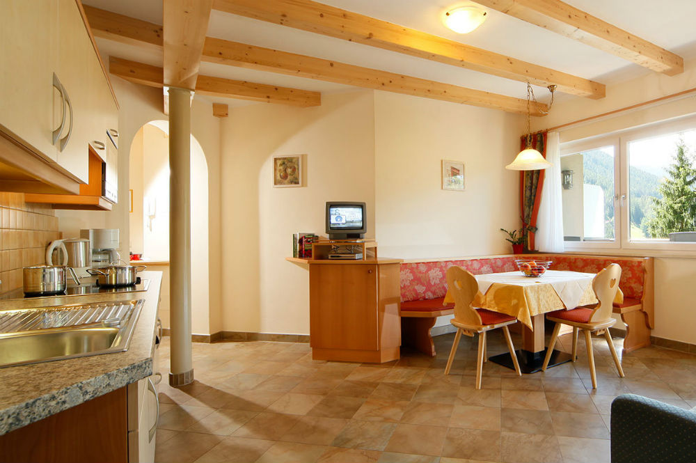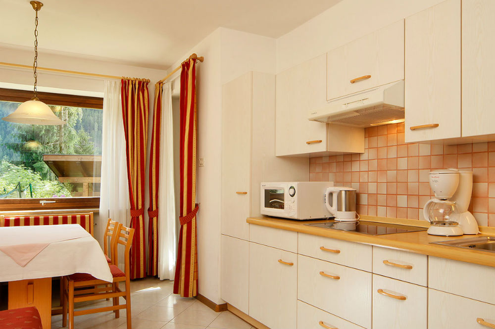 Zum Wohlfühlen laden die gemütlichen, modernen und komfortablen Ferienwohnungen ein. Sie bieten genügend Platz für 2-7 Personen und sind mit 1-2 Schlafzimmer, komplett eingerichteter Wohnküche, Bad oder Dusche, WC, Telefon und Sat-TV ausgestattet. Auch bieten die Wohnunge, je nach Lage, eine Terrasse bzw. einen Balkon. Weiterhin steht allen Gästen ein gemütlicher Aufenthaltsraum zur Verfügung. Auf Wunsch verwöhnt man Sie morgens mit frischen Brötchen und auch gerne mit Getränken. In den Genuss von Südtiroler, italienischen und internationalen Weinen kommen Sie bei der wöchentlich stattfindenden Weinverkostung im neuen Weinkeller. Hier erfahren Sie alles rund um den weißen und roten Rebensaft. Für Ihre Ski und Skischuhe steht Ihnen ein eigener Skiraum mit Trockner zur Verfügung.