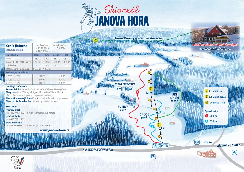 Das Skizentrum Janova Hora liegt auf einer Höhe von 750 Meter ü.M. Hier stehen den Wintersportlern drei Seilbahnen, vier Pisten und eine Kinderseilbahn zur Verfügung. Nicht nur für Kinder sind das ausgelassene Snowtubing und der Snowpark ein wahres Vergnügen. Eine Talabfahrt ist vorhanden und die Möglichkeit von Nachtskiläufen wird geboten.