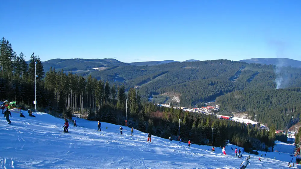 Skifahrer auf einer Piste im Skigebiet Ski Bílá , © Pufacz, Wikimedia Commons
