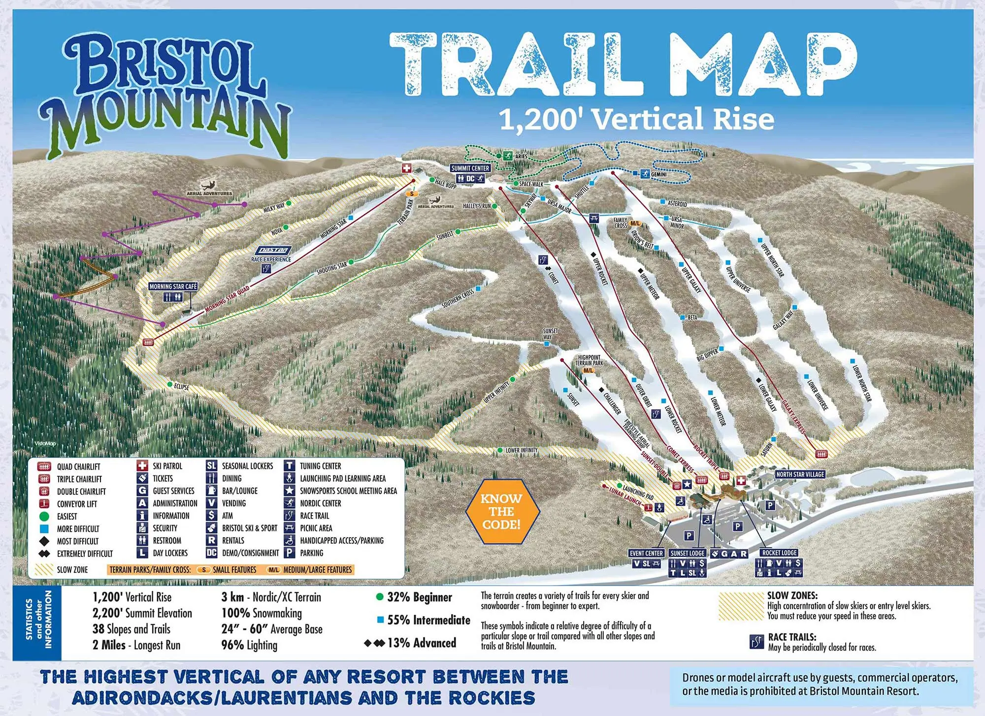 Es gibt im Bristol Mountain Resort insgesamt drei verschiedene Themenbereiche mit eigenen Schwerpunkten. Dazu gehören die Race Trails für alle Fans von Geschwindigkeit. Diese sind leider aufgrund von Wettbewerben nicht immer verfügbar, aber wenn man Zutritt bekommt kann man sich über eine perfekte Piste in Wettbewerbsqualität und natürlich auch über eine gewisse Wettbewerbsatmosphäre freuen. Es sind insgesamt zwei ausgewiesene Bereiche als Race Trails markiert, wobei beide einen eigenen Schwierigkeitsgrad vorweisen.