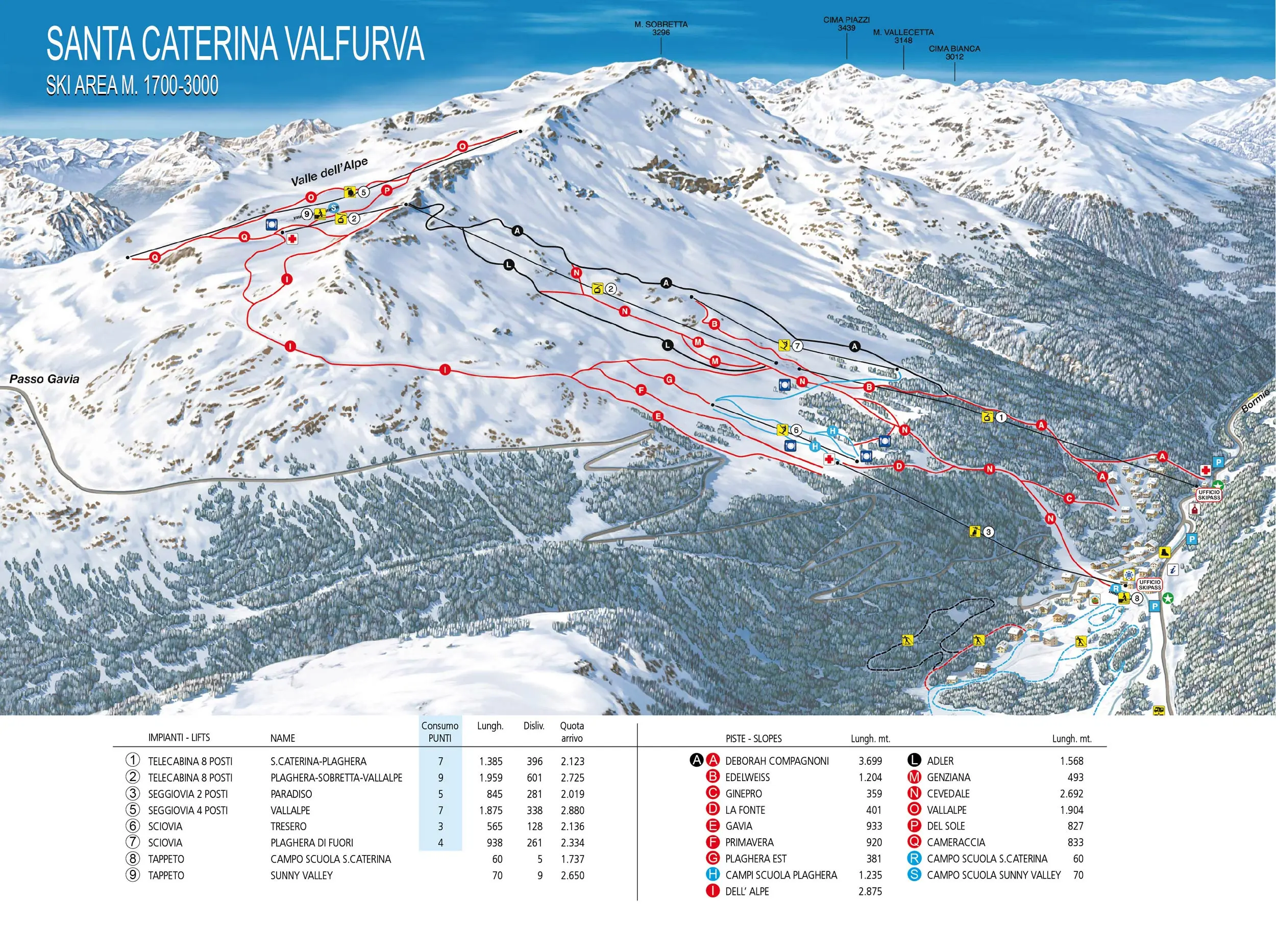 Besonders bekannt und beliebt ist die rot-schwarze Deborah Compagnoni-Piste mit einer Länge von 3,7 km. Auf dieser Abfahrt wurde im Jahr 2005 die alpinen Skiweltmeisterschaften ausgetragen. Benannt ist sie nach der dreifachen Weltmeisterin und Olympiasiegerin Deborah Compagnoni, der mit Abstand erfolgreichsten italienischen Skirennläuferin, die in Santa Caterina geboren ist. Durch eine moderne Flutlichtanlage wird die Piste auch gerne zum Nachtskilauf genutzt.