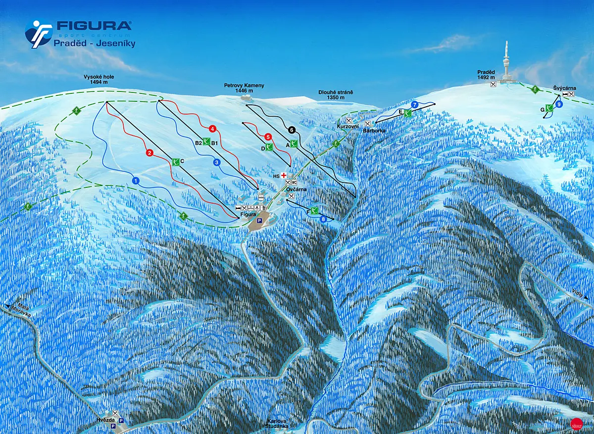 Das Skigebiet Praded - Ovcarna ist das höchstgelegene Skigebiet in der Tschechischen Republik. Die sieben Lifte liegen bis zu einer Höhe von 1.350 m. Das Skiareal bietet traditionell sehr gute Schneeverhältnisse, gerade am Anfang und gegen Ende der Saison und liegt in einem Landschaftsschutzgebiet, was allen Wintersportlern einmalige Naturerlebnisse garantiert.