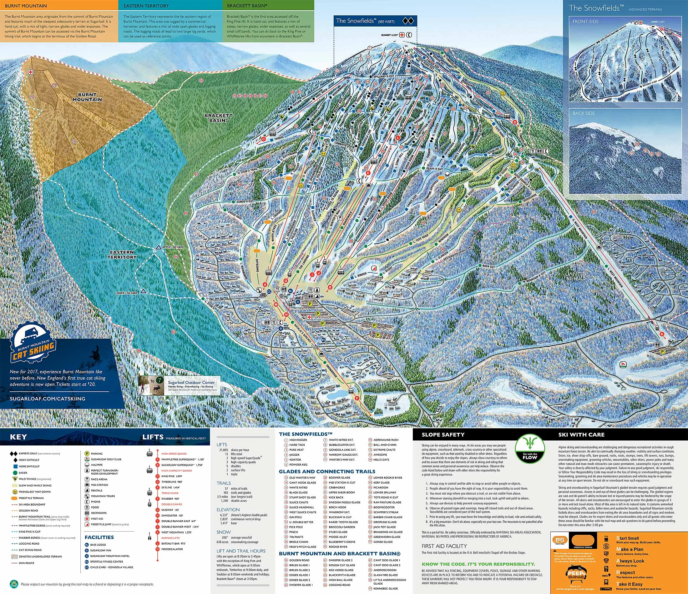 Der 2,6 km² große Brackett Basin & Burnt Mountain zeichnet sich vor allem durch Steilhänge und Chutes aus. In der King Pine Bowl und am Central Mountain gibt es die schwierigsten Pisten (schwarz und doppelt-schwarz) des gesamten Skigebiets. Am Central Mountain befinden sich außerdem die wohl extremsten Steilhänge in ganz New England. Das ideale Gebiet für Anfänger und Familien mit Kinder ist Whiffletree, das mit dem Whiffletree SuperQuad in weniger als sechs Minuten zu erreichen ist.
