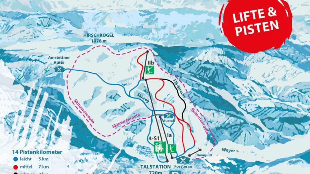 Blick auf eine menschenleere, breite Piste auf der Forsteralm