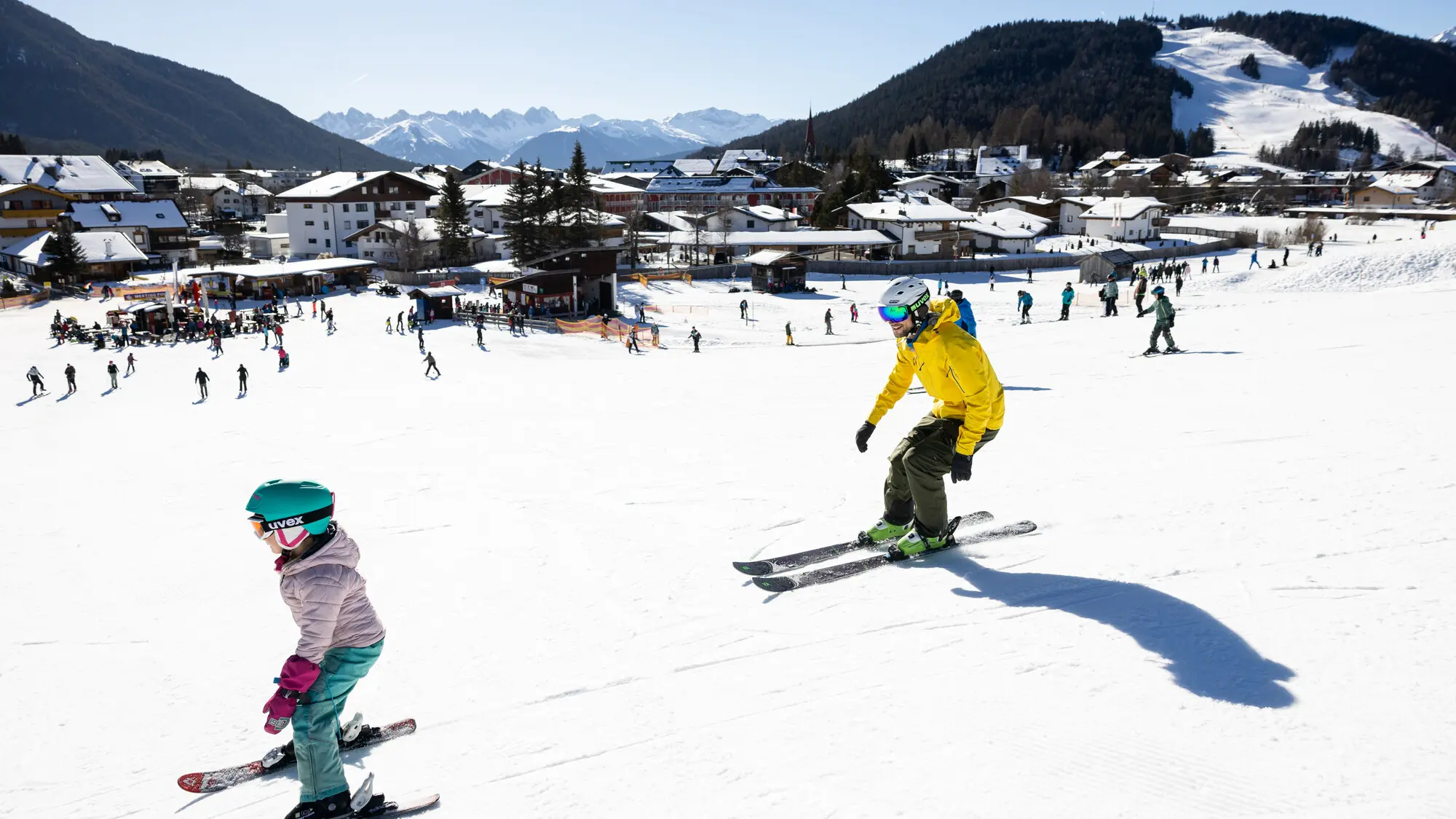 Papa und Tochter in der Abfahrt auf dem Geigenbühel in Seefeld